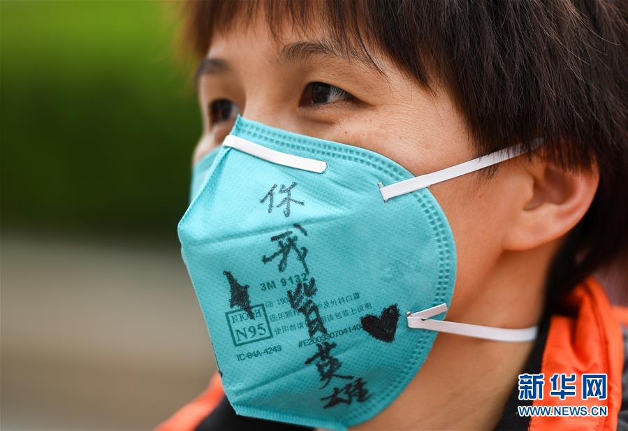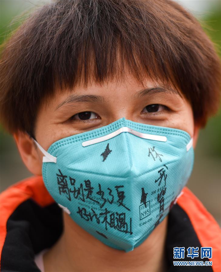 3月23日,广东第14批援鄂医疗队队员、广东佛山市南海区妇幼保健院的张秋萍在口罩上写上了一些告别的话语。 新华社记者 陈晔华 摄
