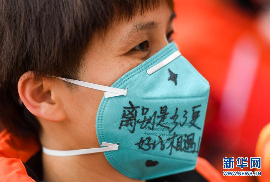 3月23日,广东第14批援鄂医疗队队员、广东佛山市南海区妇幼保健院的张秋萍在口罩上写上了一些告别的话语。 当日,广东援助湖北应对新冠肺炎疫情第14批医疗队在顺利完成各项工作任务后从武汉返回广东。 新华社记者 陈晔华 摄