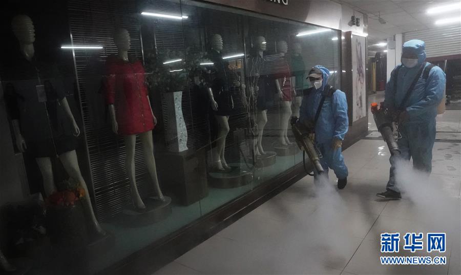 3月27日,工作人员在商城内喷药消杀。新华社记者 王毓国 摄