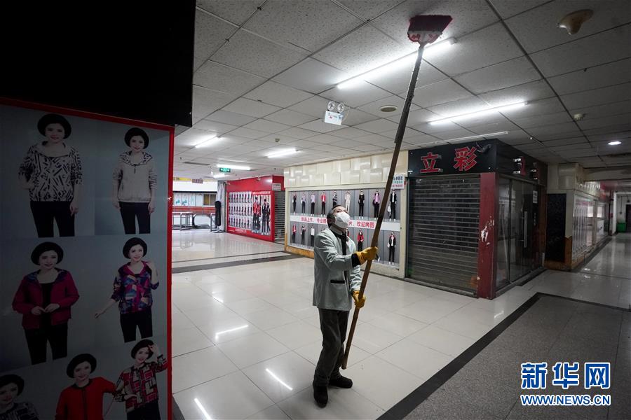 3月27日,商城清洁人员在商城内打扫天花板。新华社记者 王毓国 摄