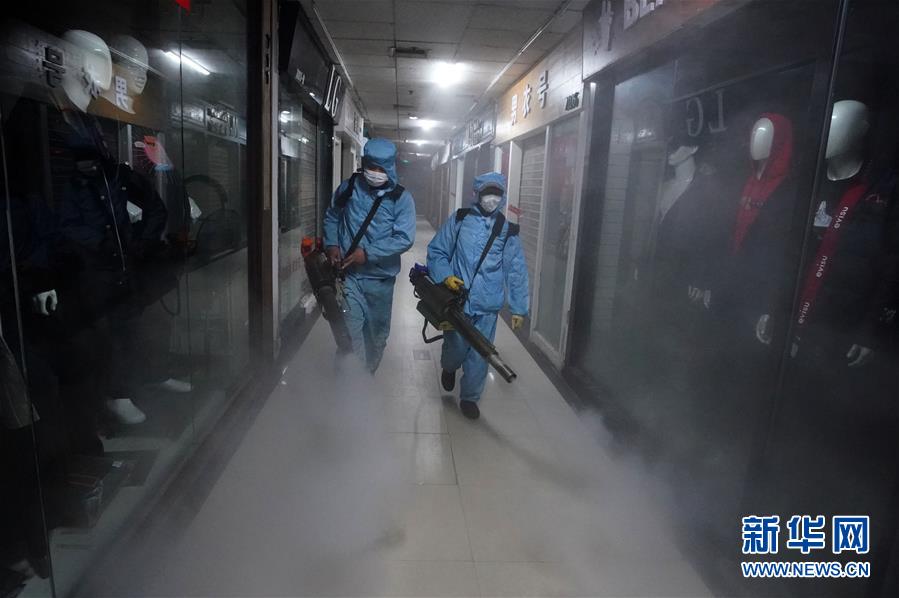 3月27日,工作人员在商城走廊内喷药消毒。新华社记者 王毓国 摄