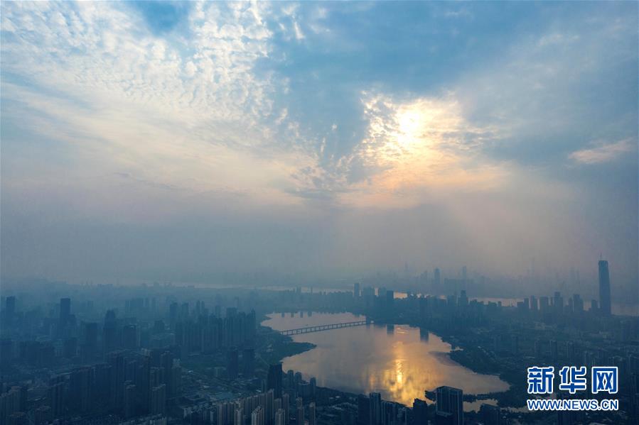 4月4日在武汉市武昌区拍摄的晚霞(无人机照片)。 当天日落时分,武汉天空出现晚霞。 新华社记者 杜华举 摄