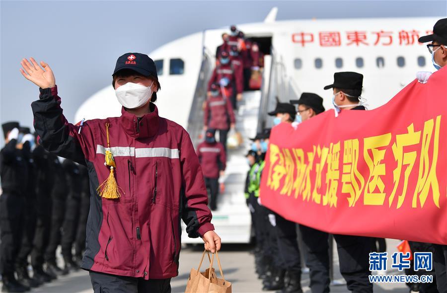 4月6日,陕西省第二批援鄂医疗队队员向迎接人员致意。 当日,陕西省第二批援鄂医疗队121人乘机抵达西安咸阳国际机场。至此,由陕西省派出的援鄂医疗队已全部平安返回。陕西省第二批援鄂医疗队于2月2日赴武汉,支援武汉协和医院西院。 新华社记者 刘潇 摄