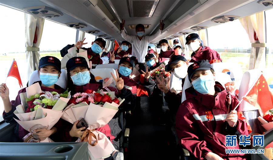 4月6日,来自西安大兴医院的援鄂医疗队队员在大巴上合影。 当日,陕西省第二批援鄂医疗队121人乘机抵达西安咸阳国际机场。至此,由陕西省派出的援鄂医疗队已全部平安返回。陕西省第二批援鄂医疗队于2月2日赴武汉,支援武汉协和医院西院。 新华社记者 刘潇 摄