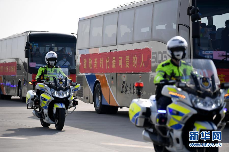 4月6日,陕西省第二批援鄂医疗队在西安交警特勤大队的护卫下离开西安咸阳国际机场。 当日,陕西省第二批援鄂医疗队121人乘机抵达西安咸阳国际机场。至此,由陕西省派出的援鄂医疗队已全部平安返回。陕西省第二批援鄂医疗队于2月2日赴武汉,支援武汉协和医院西院。 新华社记者 李一博 摄