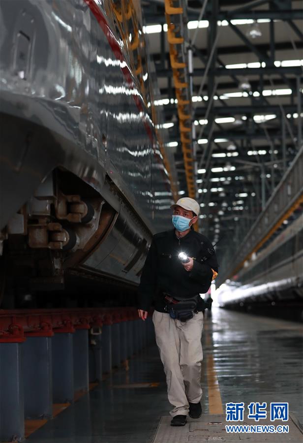 4月6日,武汉动车段一名维修人员检查高铁动车组。新华社发(赵军 摄)