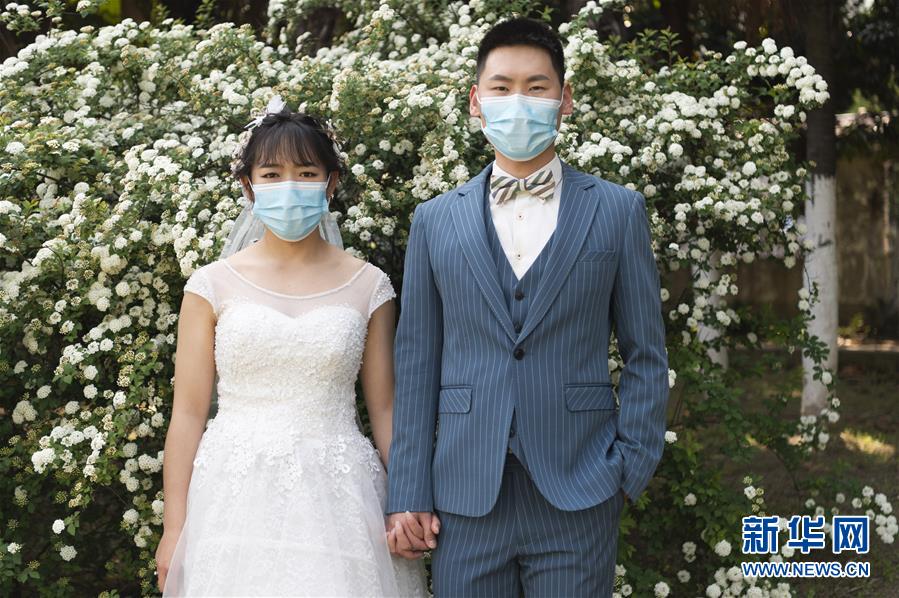 4月7日,在襄阳市老龙堤公园,王堃(右)和袁益风戴口罩拍摄婚纱照。 王堃是湖北省十堰市人,袁益风是湖北省襄阳市人。相恋一年多的两人本打算在2020年2月2日去民政局登记,让这段爱情“修成正果”,没想被疫情打乱了计划。在疫情形势好转,民政局恢复上班后,两人于3月23日登记结婚,并预约在4月7日拍摄婚纱照。 “我们都希望在拍摄婚纱照时能有一组戴口罩的照片,以纪念这段特殊时期中难忘的时光,觉得很有意义”,王堃说。 新华社发(谢剑飞摄)