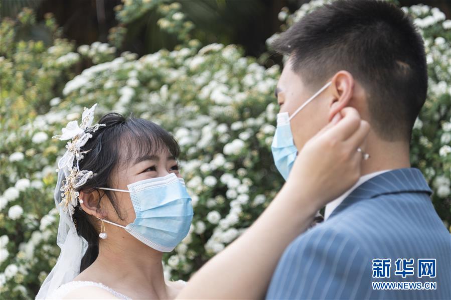 4月7日,在襄阳市老龙堤公园,袁益风(左)在拍婚纱照时为王堃整理口罩。 王堃是湖北省十堰市人,袁益风是湖北省襄阳市人。相恋一年多的两人本打算在2020年2月2日去民政局登记,让这段爱情“修成正果”,没想被疫情打乱了计划。在疫情形势好转,民政局恢复上班后,两人于3月23日登记结婚,并预约在4月7日拍摄婚纱照。 “我们都希望在拍摄婚纱照时能有一组戴口罩的照片,以纪念这段特殊时期中难忘的时光,觉得很有意义”,王堃说。 新华社发(谢剑飞摄)