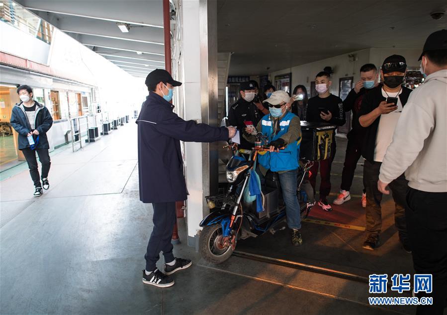 4月8日,乘客扫健康码登船。 4月8日零时起,武汉市解除离汉离鄂通道管控措施。武汉轮渡正式复航,目前武汉长江客运轮渡首先恢复了武中线和零点航班两条市内交通航线。 新华社记者 肖艺九 摄