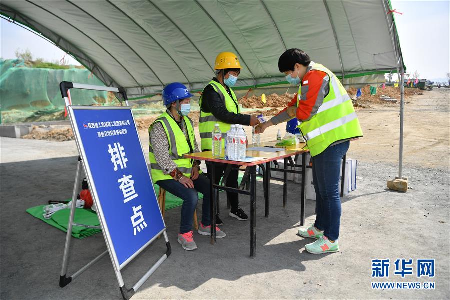陕西省安康市旬阳县神河镇的建档立卡贫困户袁昌群(中)在陕建机施集团安康机场快速干道工程项目上负责测量体温(4月9日摄)。 新华社记者 刘潇 摄