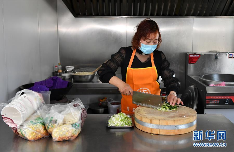 陕西省安康市汉滨区恒口镇的建档立卡贫困户王玉梅在陕建安装集团安康老机场片区棚户区改造项目上做厨师(4月9日摄)。 新华社记者 刘潇 摄