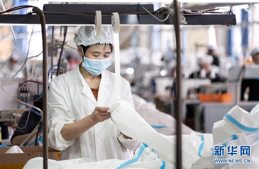 4月10日,在四川省绵阳市一家企业,工人在生产(非医用)防护服。