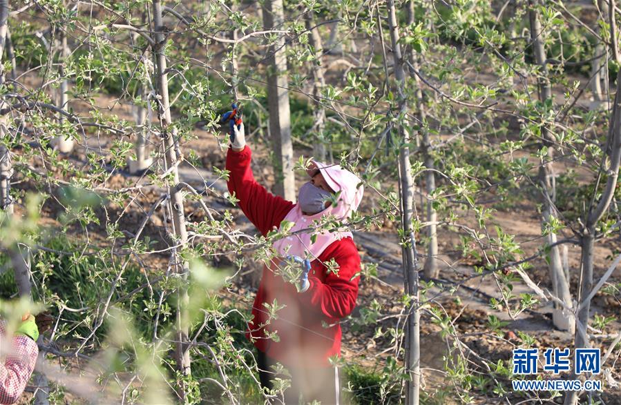 4月11日,宁县王庄村村民刘彩红在苹果生产基地内修剪果树。 新华社记者 张睿 摄