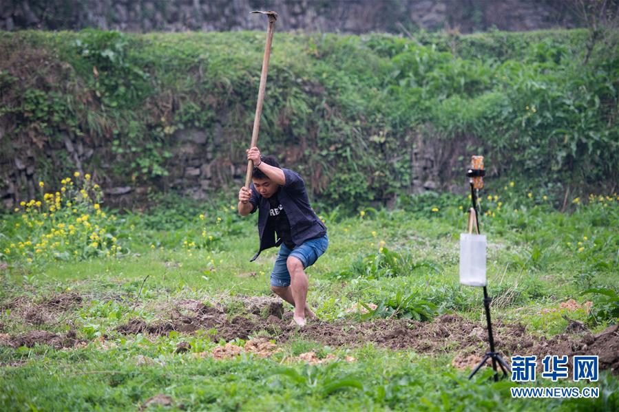 4月7日,在湘西十八洞村,施志春在直播劳作。 湖南湘西土家族苗族自治州花垣县十八洞村位于武陵山脉腹地,施志春是土生土长的十八洞村人。2017年研究生毕业后,施志春回到了家乡教授英语,是村里首位返乡工作的硕士研究生。 近年来,他积极参与家乡建设,和另外两个返乡大学生制作视频宣传家乡,帮助村民直播卖货,把十八洞村的特产卖得更远。施志春说,他还想考博士研究生,为服务家乡贡献更大的力量。 新华社发(陈思汗摄)