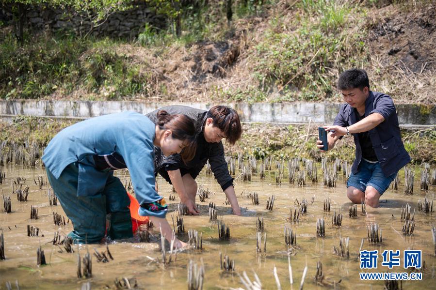 4月9日,在湘西十八洞村,施志春(右)在拍摄另外两个返乡大学生捡田螺的视频。 湖南湘西土家族苗族自治州花垣县十八洞村位于武陵山脉腹地,施志春是土生土长的十八洞村人。2017年研究生毕业后,施志春回到了家乡教授英语,是村里首位返乡工作的硕士研究生。 近年来,他积极参与家乡建设,和另外两个返乡大学生制作视频宣传家乡,帮助村民直播卖货,把十八洞村的特产卖得更远。施志春说,他还想考博士研究生,为服务家乡贡献更大的力量。 新华社发(陈思汗摄)
