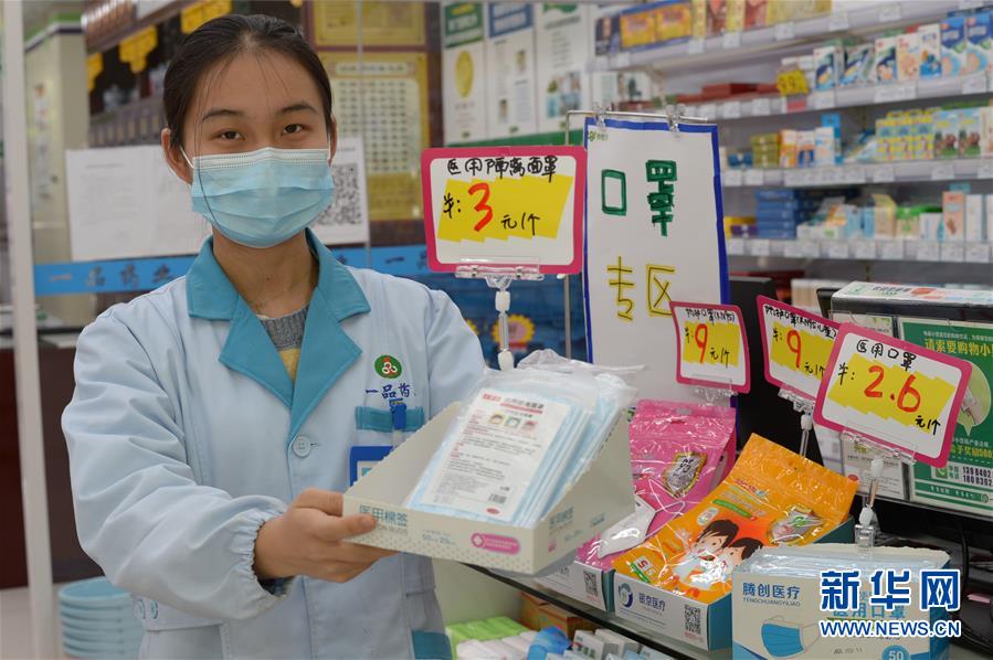 4月14日,在贵阳市云岩区一家药店,服务员在展示口罩。 4月以来,贵阳市各药店口罩供应充足,口罩价格趋于平稳,规格、类型也较为齐全。 新华社记者 杨楹 摄
