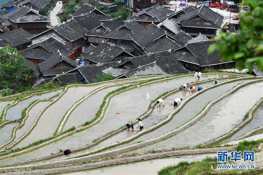 4月18日,贵州省从江县加榜乡加车村的农民在移栽稻谷小秧苗。 近日,贵州省从江县加榜乡雨量充足,梯田蓄水充盈,农民抢抓农时移栽稻谷小秧苗,梯田上一片繁忙景象。 新华社记者 杨文斌 摄
