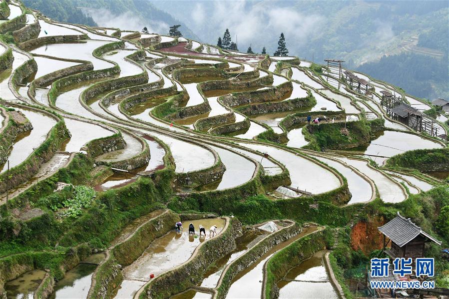 4月18日,贵州省从江县加榜乡加车村的农民在移栽稻谷小秧苗。 近日,贵州省从江县加榜乡雨量充足,梯田蓄水充盈,农民抢抓农时移栽稻谷小秧苗,梯田上一片繁忙景象。 新华社记者 杨文斌 摄