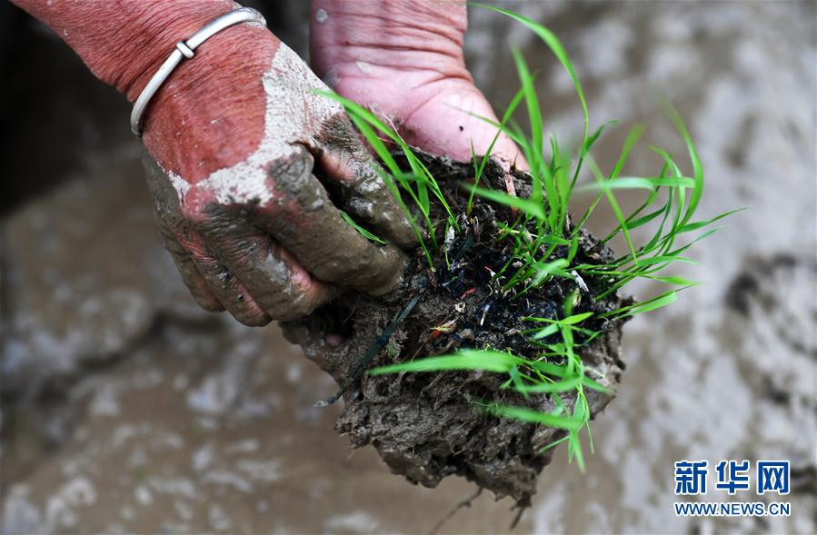 4月18日,贵州省从江县加榜乡加车村的农民在移栽稻谷小秧苗。 近日,贵州省从江县加榜乡雨量充足,梯田蓄水充盈,农民抢抓农时移栽稻谷小秧苗,梯田上一片繁忙景象。 新华社记者 杨文斌 摄