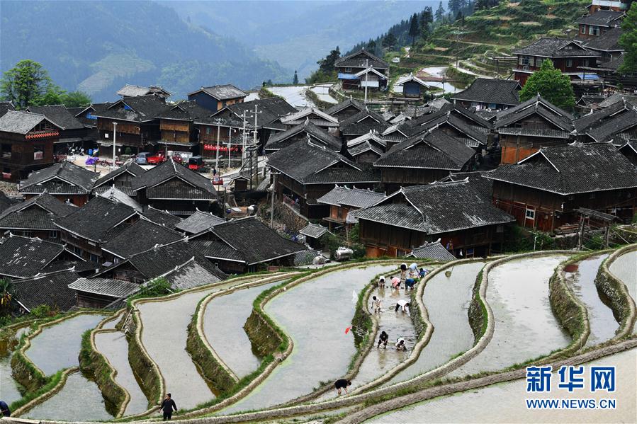 4月18日,贵州省从江县加榜乡加车村的农民在移栽稻谷小秧苗。 近日,贵州省从江县加榜乡雨量充足,梯田蓄水充盈,农民抢抓农时移栽稻谷小秧苗,梯田上一片繁忙景象。 新华社记者 杨文斌 摄