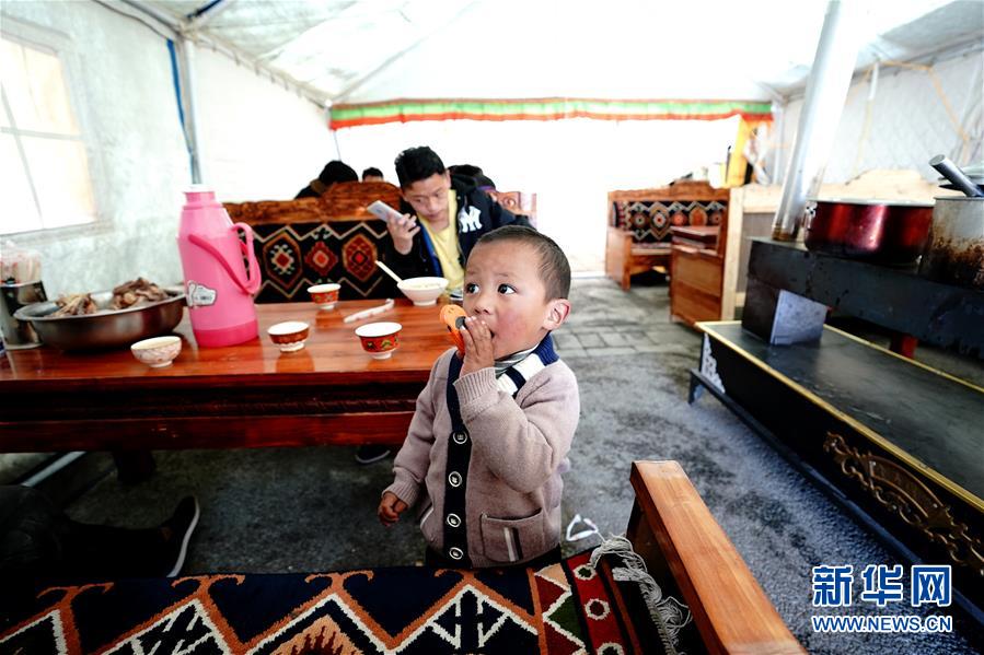 在森布日极高海拔地区生态搬迁安置点,客人在帐篷甜茶馆里享用美食,格多的小儿子普巴多杰在帐篷甜茶馆里玩耍(4月15日摄)。新华社记者 詹彦 摄
