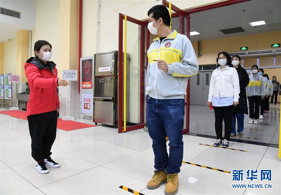 4月20日,在北京市第二中学,参加模拟演练的教师演练学生在食堂间隔1米排队等待用午餐。新华社记者 任超 摄
