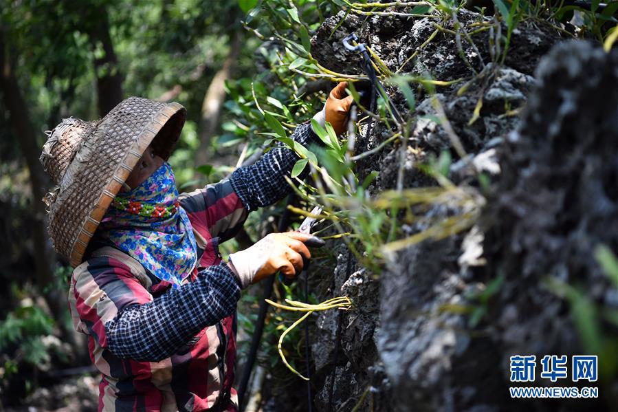 4月21日,施茶村村民王秀文在石斛园采摘石斛鲜条。 新华社记者 郭程 摄