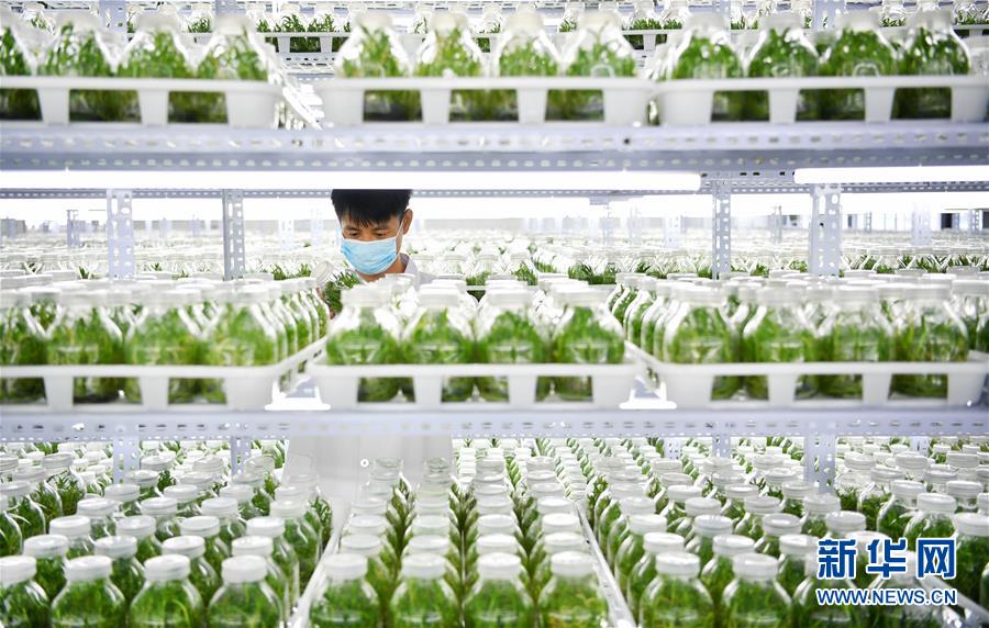 4月21日,在位于施茶村的海南胜嵘生物科技有限公司石斛育种培养室内,工作人员查看石斛种苗的生长情况。 新华社记者 郭程 摄