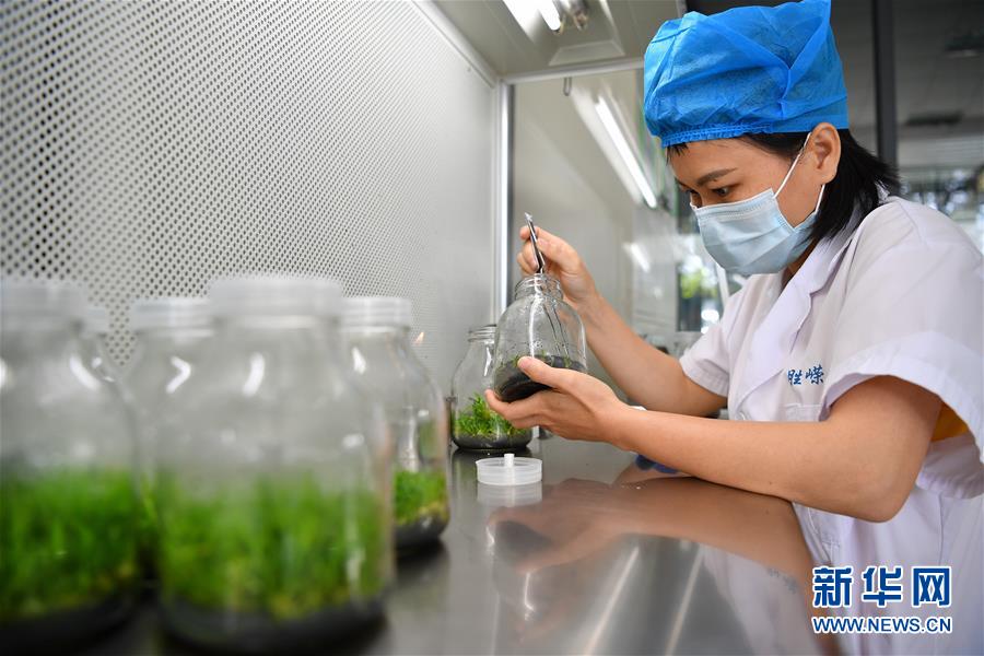 4月21日,在位于施茶村的海南胜嵘生物科技有限公司石斛育种培养室内,工作人员在进行石斛育种。 新华社记者 郭程 摄