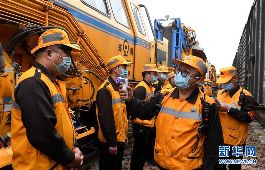 4月20日,郑州工务机械段工作人员在出发前进行体温测量。