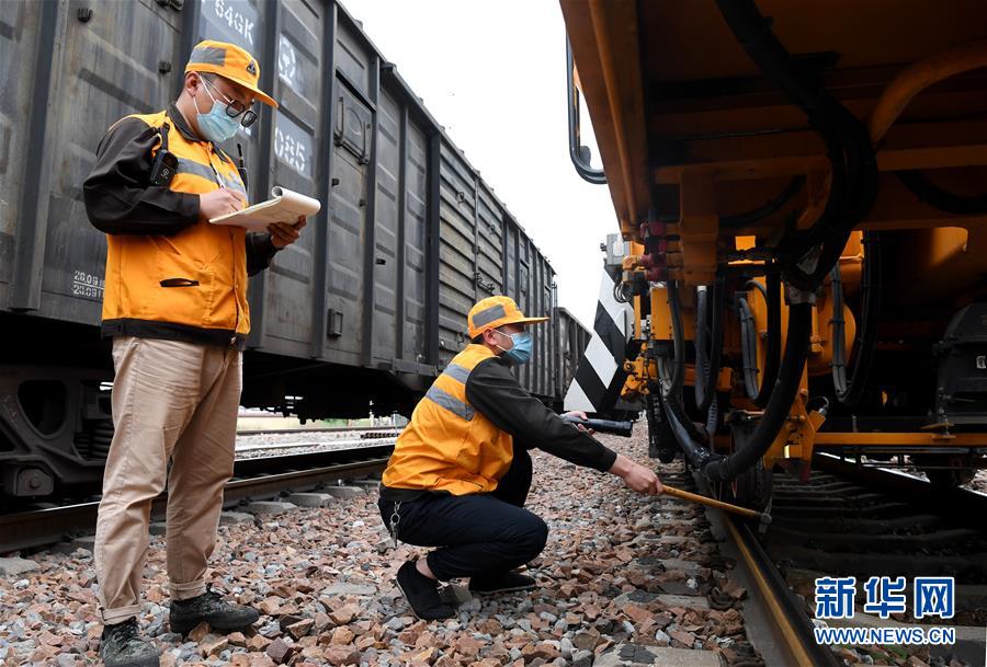 4月20日,郑州工务机械段工作人员在出发前进行环车检查。 新华社记者 郝源 摄