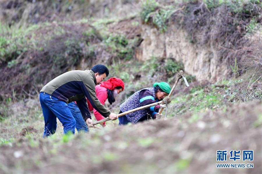 勒阿村驻村第一书记张金利(左)和村民一起在地里种植山野菜(4月22日摄)。 新华社记者 陈斌 摄