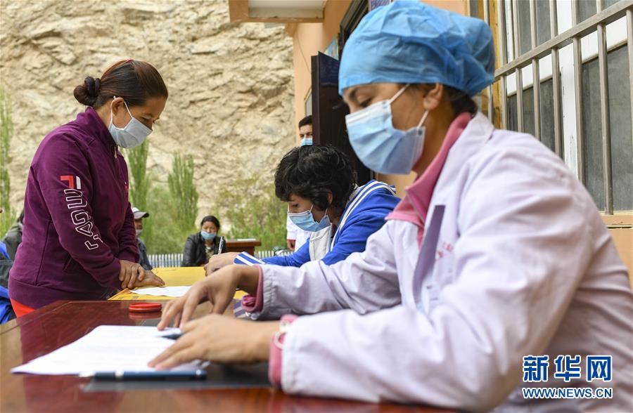 在新疆叶城县西合休乡亚尔阿格孜村的卫生室,村民排队问询体检反馈信息(5月2日摄)。新华社记者 胡虎虎 摄