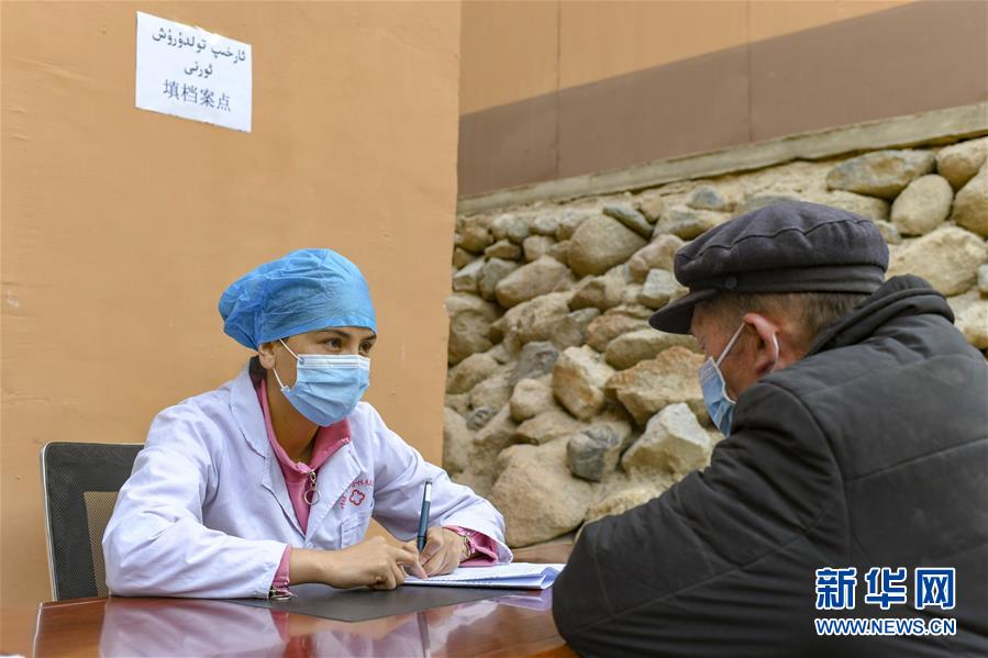 在新疆叶城县西合休乡亚尔阿格孜村的卫生室,27岁的西合休乡卫生院医生姑再丽努尔·赛麦提(左)为村民登记体检信息(5月2日摄)。新华社记者 胡虎虎 摄