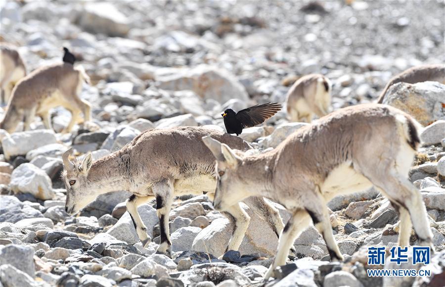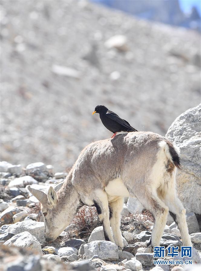 一只黄嘴山鸦停留在岩羊身上(5月8日摄)。当日,一群岩羊在珠峰大本营周围觅食,黄嘴山鸦飞到岩羊身上停留,构成一幅幅生动有趣的雪域图画。新华社记者晋美多吉摄
