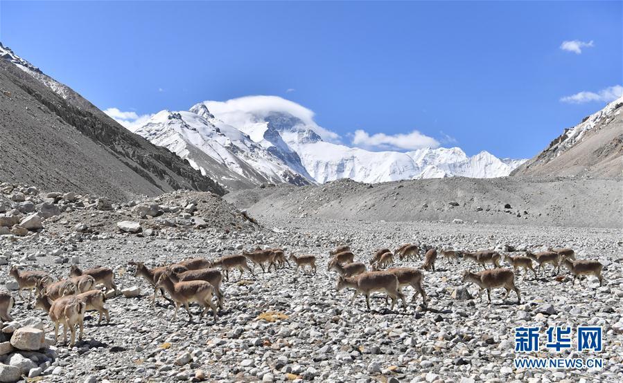 一群岩羊在珠峰大本营附近觅食(5月8日摄)。当日,一群岩羊在珠峰大本营周围觅食,黄嘴山鸦飞到岩羊身上停留,构成一幅幅生动有趣的雪域图画。新华社记者普布扎西摄