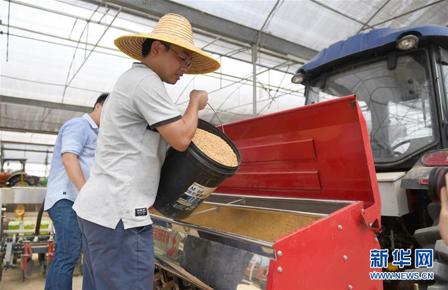 5月9日,工作人员在无人驾驶旱直播机进行作业前添加谷种。 当日,一次无人播种作业在广州市增城区的华南农业大学教学科研基地里展开。 上午9点20分,一台无人驾驶旱直播机从基地的机库里缓缓驶出大门,出门右转,数十米后左转,直行100多米后再右转,越过一片土地后,进入计划播种的14亩土地中,开始进行丝苗米播种作业。这台播种机用了1小时25分钟、来回走了32圈完成播种作业,随后驶回机库,停到出发时的位置上。 这是中国工程院院士罗锡文及其团队的无人农场项目一次播种示范。据介绍,无人农场包括智能化耕整、播种、田间管理和收获四个环节,是信息技术、智能农机和农艺技术高度结合的生产方式。 新华社记者 卢汉欣 摄