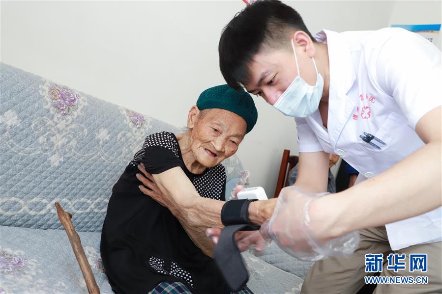 5月10日,医生为老人检查身体。 当日,中建四局志愿者和职工医院医生来到贵州省仁怀市龙井镇复兴村,为15名平均年龄86岁的老母亲过节,并为她们检查身体、表演节目。 新华社记者 刘续 摄