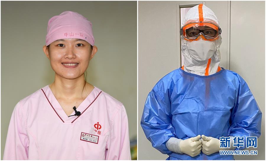 拼版图片:左图为5月9日陈志昊在中山大学附属第一医院午休时间的留影;右图为她在武汉身穿防护服的留影(受访者提供)。