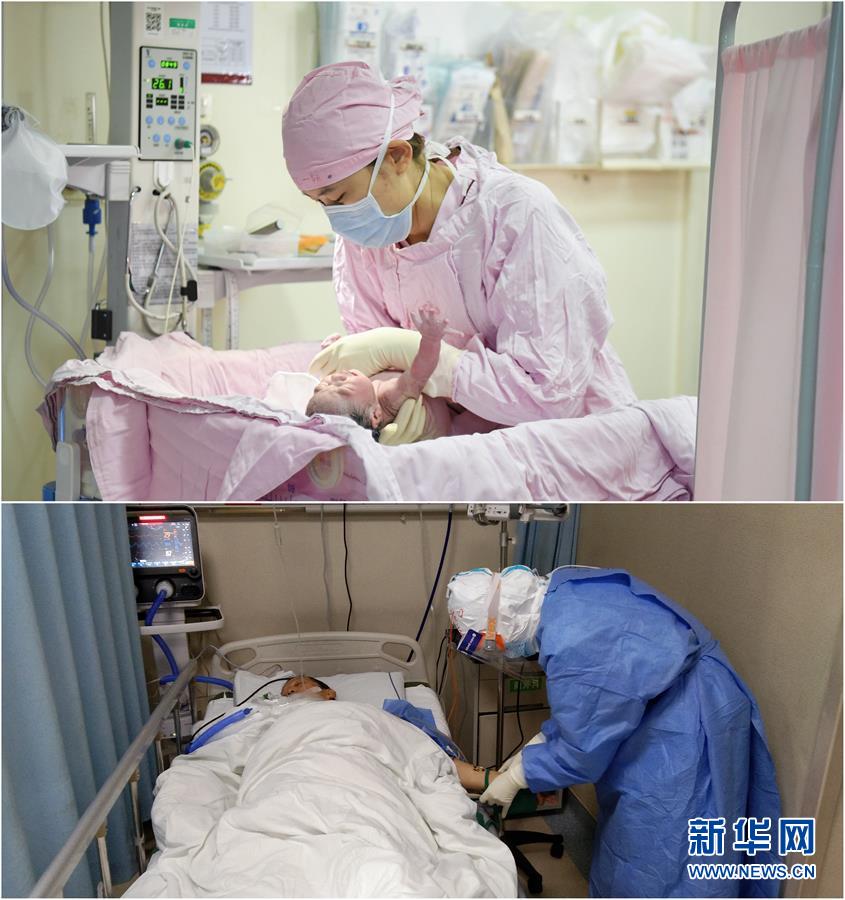 拼版图片:上图为5月9日,陈志昊在中山大学附属第一医院照顾刚出生的婴儿;下图为她在武汉为新冠患者进行动脉采血(受访者提供)。 新华社记者邓华摄