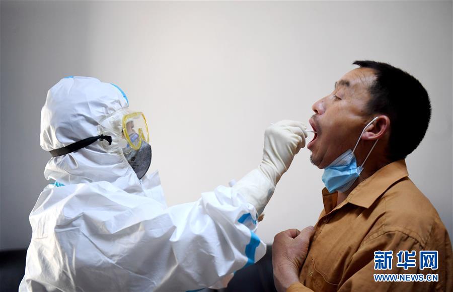 5月12日,在文安县一家公司,当地疾控中心工作人员为湖北籍返岗工人进行咽拭子采样。 河北省文安县为返岗的湖北籍企业员工提供上门免费核酸检测服务,在为企业和返岗员工提供方便的同时,为复工复产提供安全保障。 新华社记者 王晓 摄