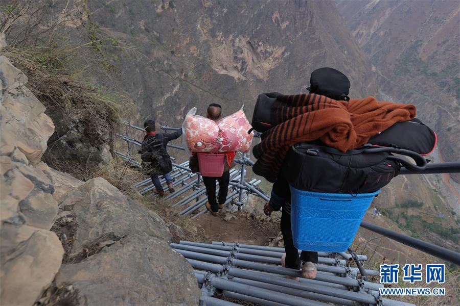 5月13日,“悬崖村”村民背着东西沿着钢梯下山,准备搬进昭觉县城易地扶贫搬迁安置点的新家。新华社记者 江宏景 摄