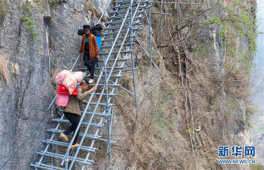 5月13日,莫色达体夫妇背着东西沿着“悬崖村”的钢梯下山,准备搬进昭觉县城易地扶贫搬迁安置点的新家。新华社记者 江宏景 摄