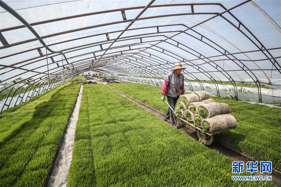 5月24日,盘锦市大洼区的农民在育苗棚内搬运符合插秧标准的水稻秧苗。新华社记者 潘昱龙 摄