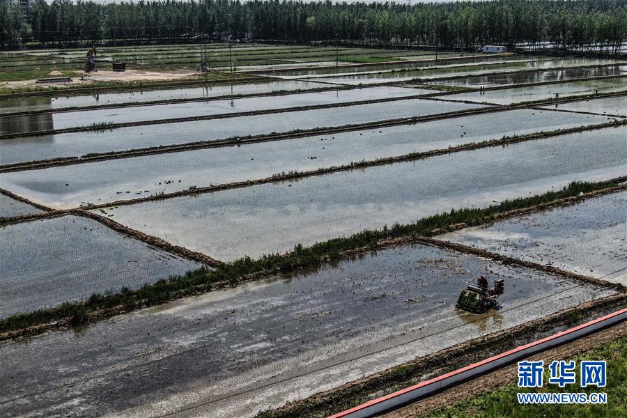 5月24日,盘锦市大洼区的农民在驾驶插秧机插秧(无人机照片)。新华社记者 潘昱龙 摄