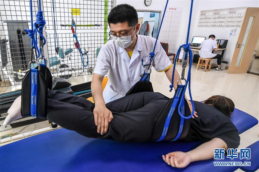 5月25日,在常州市体育医院,一位市民在工作人员帮助下进行悬吊,放松腰部。 新华社记者李博摄
