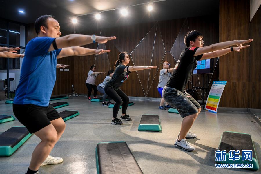 5月25日,在常州市体育医疗科研所,市民们在工作人员带领下进行有氧踏板操训练。 新华社记者李博摄