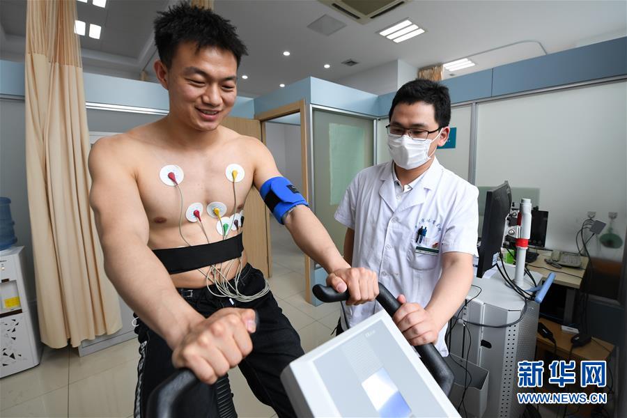 5月25日,在常州市体育医院,一位市民(左)在进行运动负荷心电图测试。 新华社记者李博摄