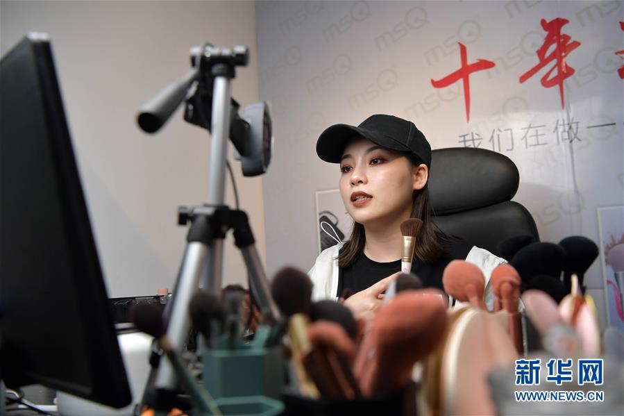 在江西省南昌市青山湖区一家电商企业的直播间内,主播线上直播销售化妆刷(5月15日摄)。 今年以来,江西省南昌市青山湖区引进企业,打造以“电商+直播”为新业态的产业集群,主播们根据产品特色和平台需求,推介互动,带动了电商产业的发展。 新华社记者 彭昭之 摄