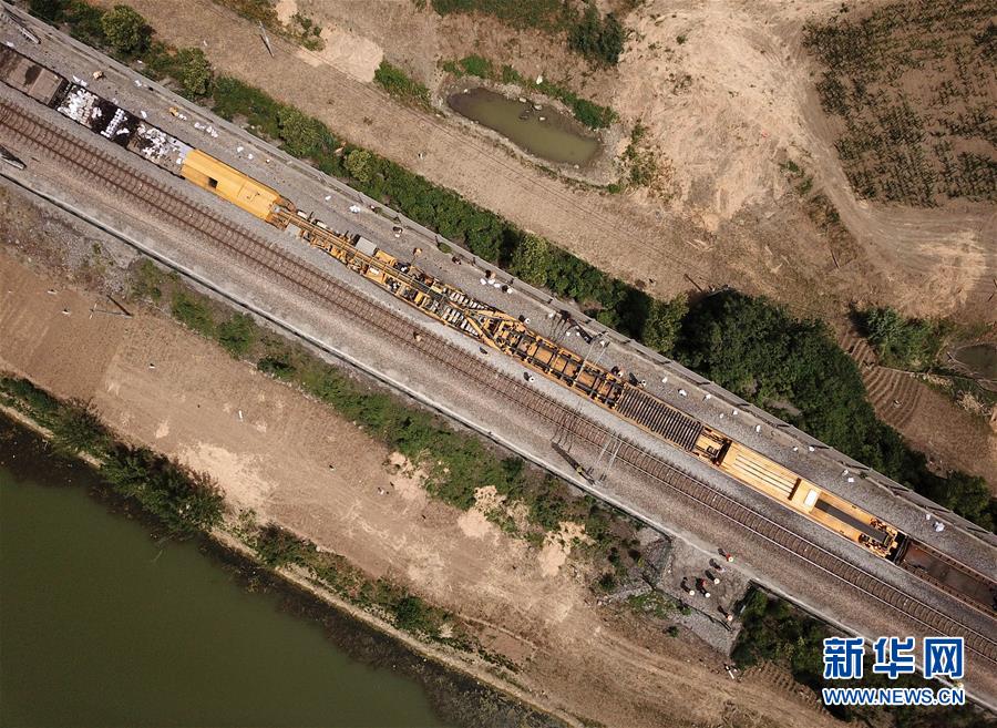 6月3日,施工人员在京九铁路线上进行更换水泥枕施工(无人机照片)。 近日,由中国铁路上海局集团有限公司上海工务大修段、上海大机运用检修段等单位共同参与的京九铁路下行线颍南至三塔镇区间9.7公里水泥枕更换工程有序进行。换枕施工完成后,将进一步提升线路的安全性和稳定性,为即将到来的暑运保驾护航。 新华社记者 刘军喜 摄